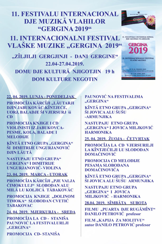 Na vaskršnji ponedeljak i utorak, 29. i 30. aprila 2019. godine, Negotin će biti u znaku dobre pevane i svirane vlaške muzike i raznovrsnog kulturnog nasleđa Vlaha. Brojne objedinjene sadržaje ponudiće i ove sezone Udruženje za očuvanje kulture i tradicije Vlaha „Gergina“, organizator istoimenog festivala vlaške muzike, koji je prošle godine zablistao punim sjajem prilikom obeležavanja svog prvog desetogodišnjeg jubileja. Iako je do početka manifestacije ostalo nešto više od mesec dana, organizatori već sada poručuju da bi Festival mogao da počne s obzirom da su učesnici i sadržaji već utvrđeni i da će se u narednom periodu raditi na doradi i brušenju planirane ponude sa kojom će Festival iskoračiti pred ljubitelje vlaške veoma bogate kulture.